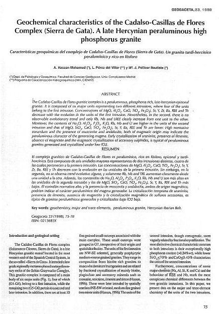 Este trabajo, titulado "Geochemical characteristics of the Cadalso - Casilas de Flores Complex (Sierra de Gata). A late hercynian peraluminious high phosphorus granite", publicado en 1998, es de los ya escasos trabajos petrológicos que se están realizando en la provincia de Cáceres.